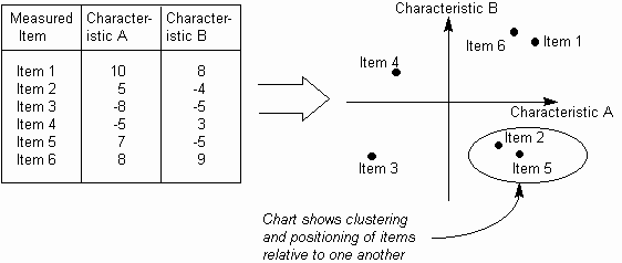 Matrix Data Analysis Chart (MDAC)When comparing a large set of items, the complexity of the situation can make it difficult to determine how different factors relate to one another. In particular, it can be useful to find groups of items that behave in similar ways. For example, a washing powder may have different efficiencies at achieving 'softness' and 'stain removal' in garments made of acrylic, polyester, wool and various fiber mixtures. If similar affects are found in a group of fibers, then changing the powder ingredients may affect the whole group in a similar way. The Matrix Data Analysis Chart (or MDAC) helps classify items by identifying two major characteristics common to all items and then plotting each item as a point on a standard x-y chart. This makes it easier to see how the individual items relate both to the characteristics and to one another, thus: See also:Second seven toolsToolbook chapter: Matrix Data Analysis Chart (MDAC) |