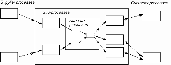 In practice, there can be many customers of a process, as producing a faulty output may not only cause problems for the following process, but also (if the output is passed on in any way) for the other indirect customers further down the chain. Thus the customers of a design engineer include not only the production engineer, but production line workers, sales people and so on through to the end customer, as a bad design will affect all these people. NestingEach process may itself contain other processes, which in turn may contain further processes. This nesting can make processes easier to understand at different levels, as shown below.